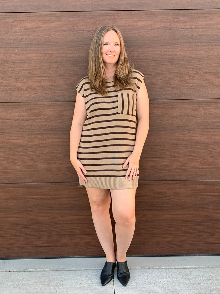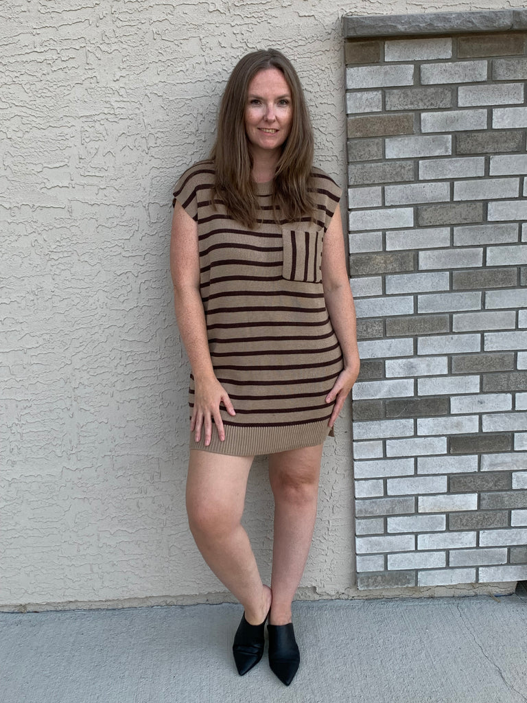 Stripe Print Round Neck Short Sleeve Dress Featuring Pocket Detail At Bust And Side Slits.