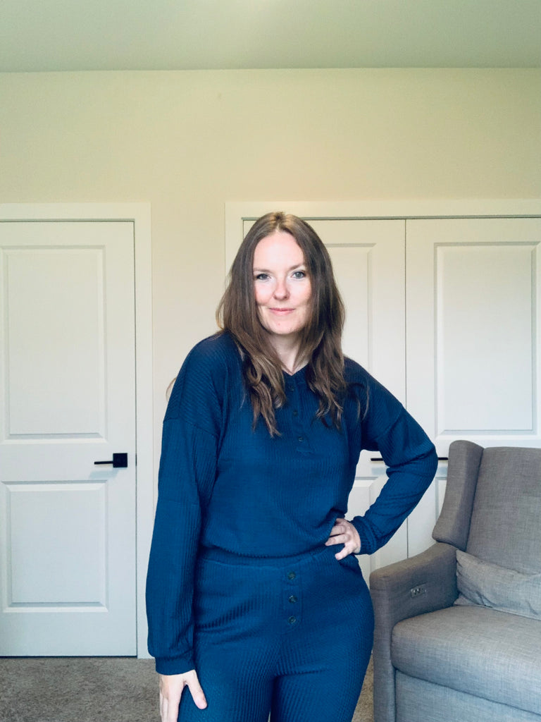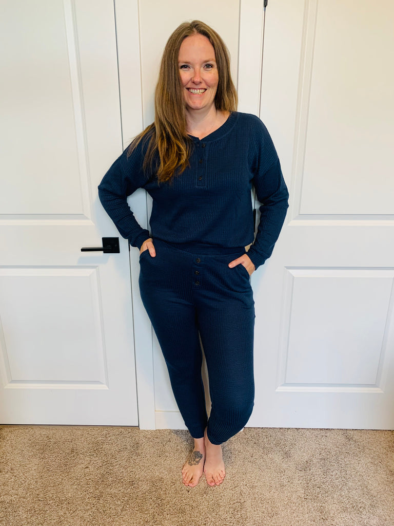A cozy waffle set! The Top has a round neckline, long sleeves and a front button down detail. The pants have a high rise with elasticized waist and straight legs, fitted cuff detail and pockets.