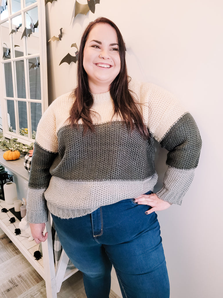 Cozy color block sweater, long sleeve scoop neckline detail with long sleeve. A relaxed silhouette, this sweater will be your favorite through the fall season.